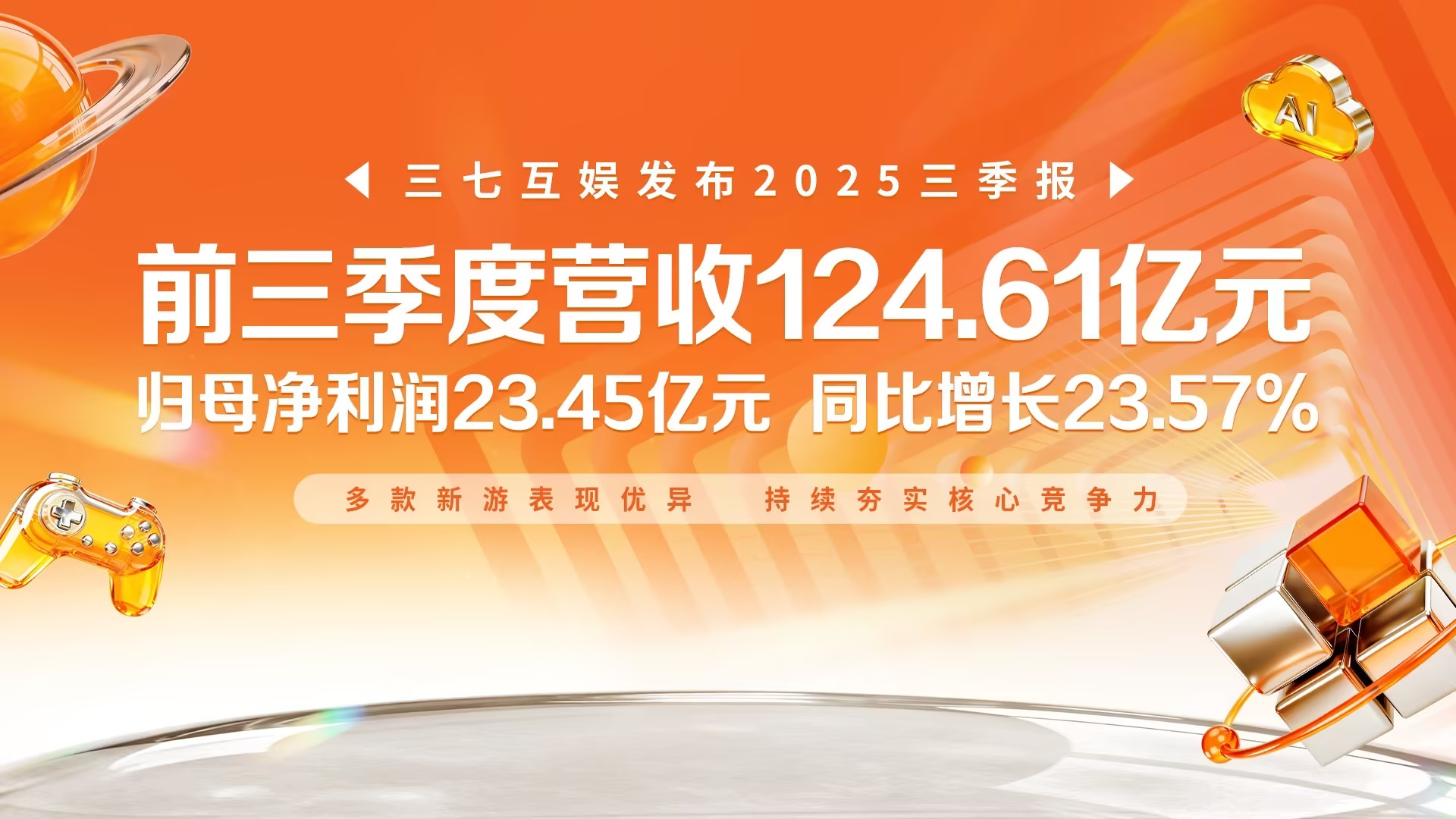【环球网财经概括报谈】10月28日唐山股票配资平台,三七互娱发布2025年第三季度讲授。2025年1-9月,公司兑现买卖收入124.61亿元,包摄于上市公司股东的净利润23.45亿元,同比增长23.57%。其中,公司第三季度兑现买卖收入39.75亿元,包摄于上市公司股东的净利润9.44亿元,同比增长49.24%,功绩持重增长。