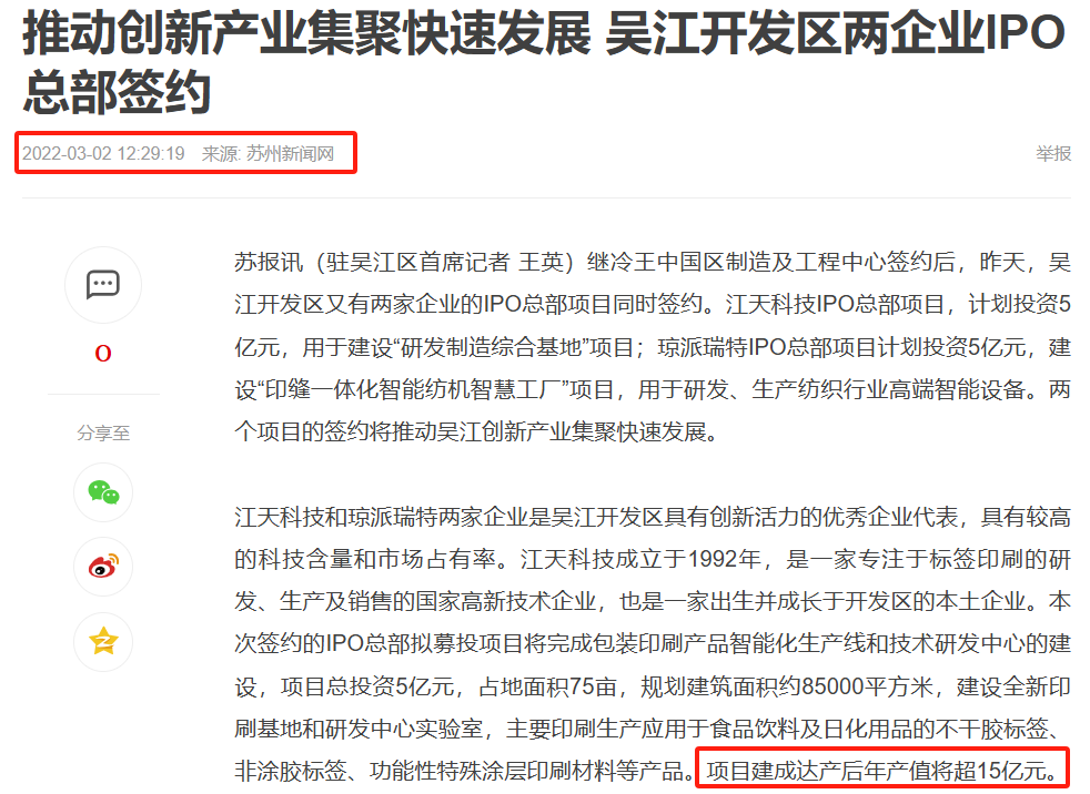 而《苏州新闻网》此前在2022年发布过报说念《股东转换产业汇聚快速发展 吴江开发区两企业IPO总部签约》,其中提到江天科技“本次签约的IPO总部拟募投名目将完成包装印刷家具智能化出产线和技能研发中心的诞生,名目总投资5亿元”,这与本次招股书暴露的投资总和一致;但该报说念还提到,此名目经兴建筑面积约85000平方米,则与招股书暴露存在浩大各异。